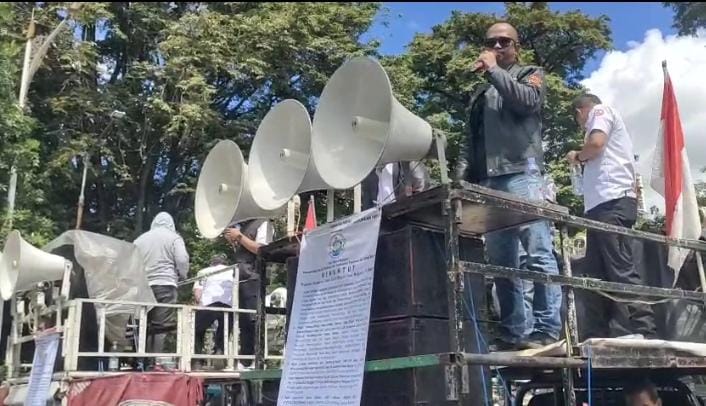 JABARONLINE.COM – Ratusan warga dari Kecamatan Cigudeg, Rumpin, dan Parungpanjang, Kabupaten Bogor Barat, bersama sejumlah aliansi transporter, menggelar aksi demonstrasi di depan Gedung Sate, Bandung. Mereka menuntut Gubernur Jawa Barat Dedi Mulyadi segera memberikan kepastian hukum dan solusi atas dampak penutupan tambang di wilayah mereka, Jumat, 6 Februari 2026.